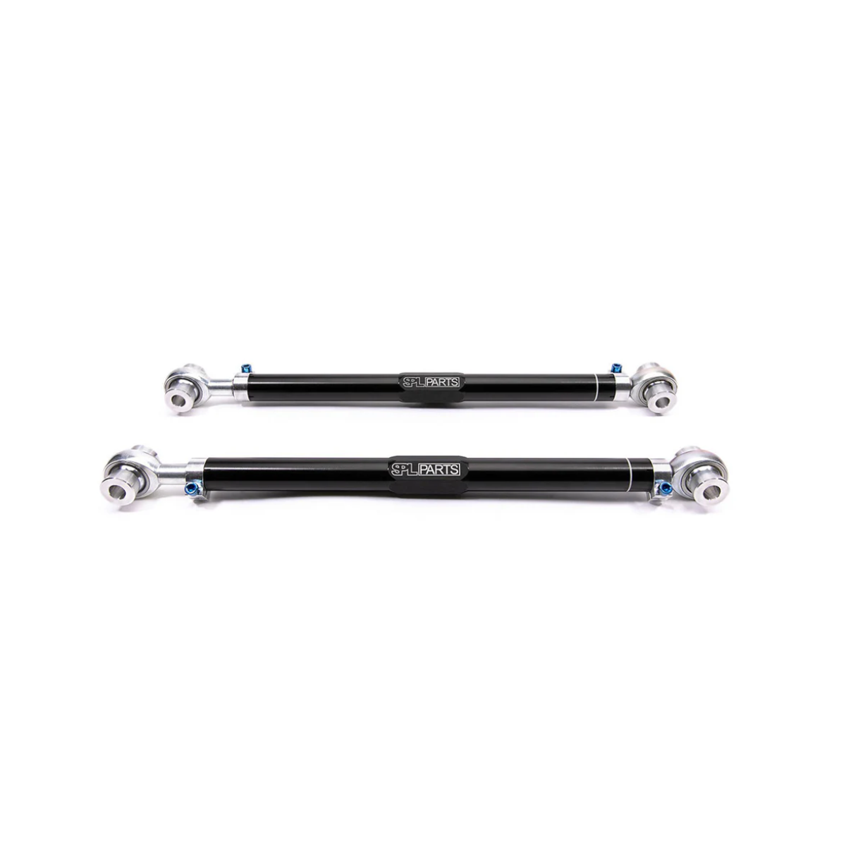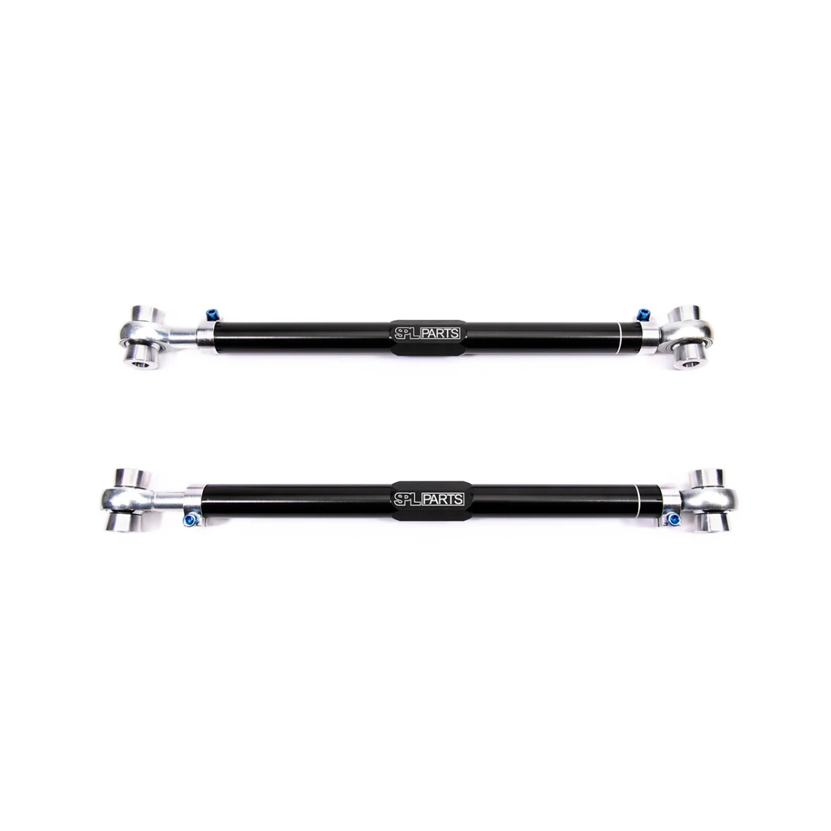 SPL Parts Rear Toe Arms (RTA) for the 2020+ Toyota Supra, and BMW G2X increase stability and response by eliminating bushing deflection while providing an increased range of rear toe adjustment, necessary for lowered cars or for performance alignments. Even small changes to ride height and camber will affect toe settings, and the wide range of adjustment allows you to maximize grip on a track car and extend tire life on a street car. The factory rear toe arms utilize an eccentric bolt and washer for adjustment and lack the precision and range that SPL Parts rear toe links offer. Black Anodized and gun drilled 2024 Aluminum main links along with our 360 degree Rotating Clamp design allow for quick and precise adjustment. The Rotating Clamps are tightened with Blue Anodized Titanium Socket Head Cap Screws for easy to access adjustment, and shaves even more unsprung weight, without compromising strength.