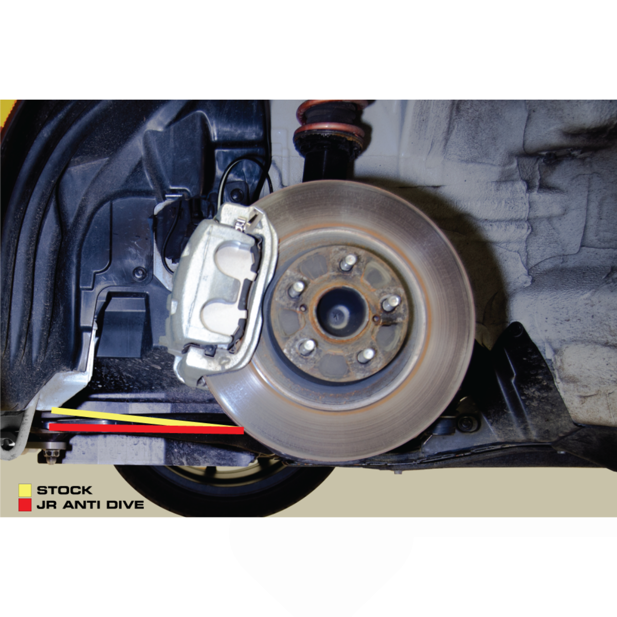 Anti-dive geometry is achieved by leveling the pivot axis of the control arm, thus reducing the amount of “dive” on the front-end during the braking/corner entry phase. This gives the car a more level stance, allowing the driver to have a more controlled and balanced entry to the corner.