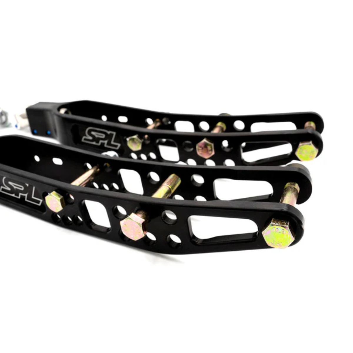 Using FEA (Finite Element Analysis) our CNC milled 6061-T6 Billet Aluminum Arms are designed to exceed factory strength and durability. Our exclusive Hybrid Adjuster is comprised of electroless nickel plated 4130 Chromoly. SPL Blue Anodized Titanium hardware and 6061-T6 Aluminum Clamps help reduce weight and prohibit corrosion while offering quick and easy adjustment.