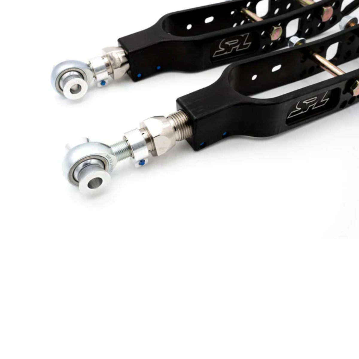SPL Parts Titanium Series adjustable Rear Lower Camber Arms (RLL) increase stability and response by eliminating bushing deflection and offer a wide range of camber adjustment. These arms are designed for use in high performance street and race vehicles. Without factory camber adjustment, a lowered FR-S/BRZ requires an adjustable control arm to achieve your desired alignment settings to maximize tire wear and handling. Three position mounting holes for sway bar endlinks and shock mounting allows you to alter geometry to prevent endlink binding, quickly adjust motion ratios, and resulting spring and sway bar effectiveness. Simply put, it’s like having adjustable spring rates without a spring replacement.